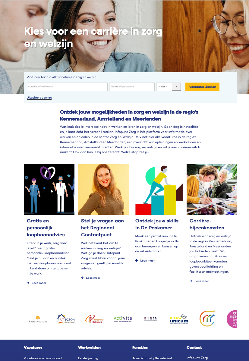 De bundeling van krachten heeft geresulteerd in een eigentijds vacaturesysteem. Het systeem biedt integratie met Google-for-Jobs, is vergaand op SEO ingericht en koppelt eenvoudig met diverse recruitmentsystemen. Dit leidt tot verhoogde respons en méér en betere kandidaten. Daarnaast bevat www.infopuntzorg.nl handige informatie over werken en opleiden, werkvelden en functies, inspiratie en een uitgebreid overzicht van de aangesloten werkgeversorganisaties.